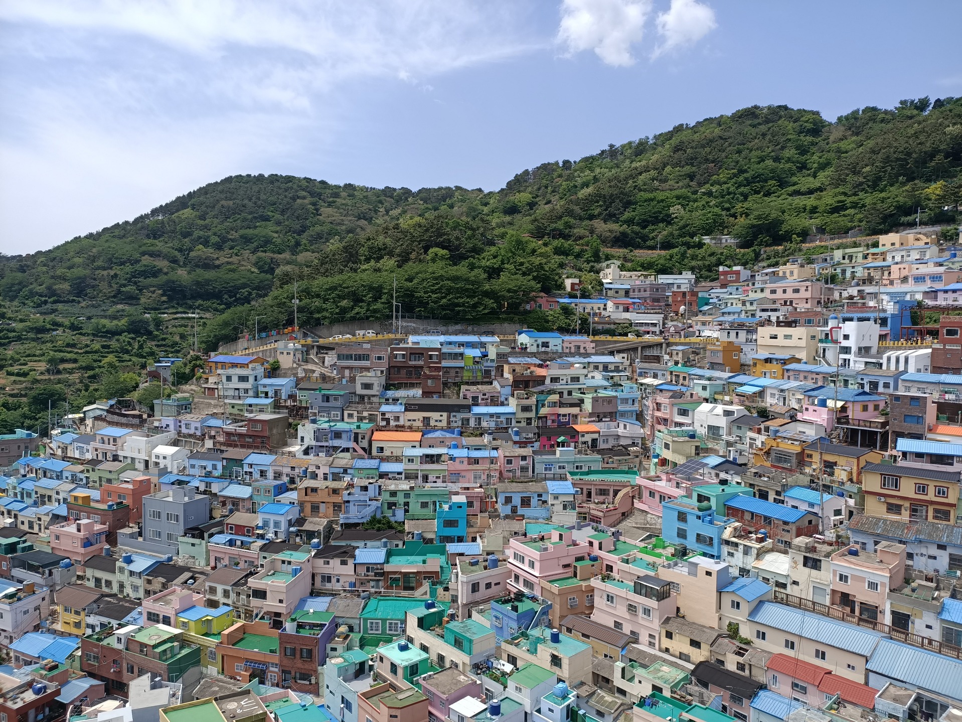 Le village de Gamcheon est situé dans la province de Gyeongsangnam-do. Il est niché sur le flan d’une montagne au bord de la mer de l'Est. Le village a été fondé en 1955 par Cho Chol Je, le fondateur d’une nouvelle religion appelée « Taegeukdo ». Celle-ci repose sur le « Taeguk » c’est-à-dire le symbole du Yin et Yan qui représente le vrai sens de la vie et de l’univers, la balance entre le Bien et la Mal dans le monde. Cho Chol Je en a fait son quartier général et l’a nommé le « Taegeukdo Village » en 1955.